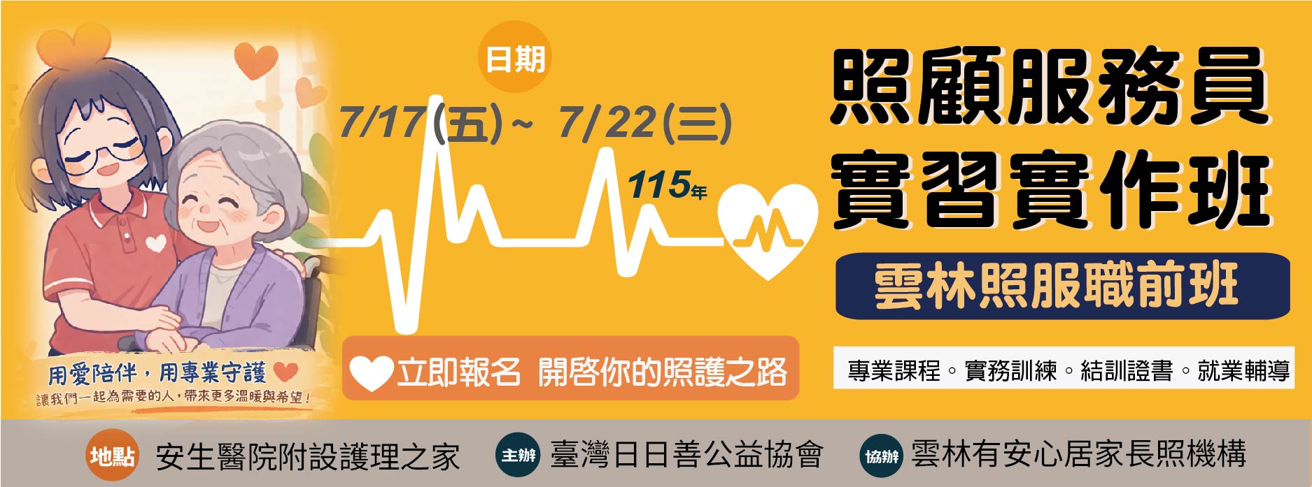 高齡社會已成為全球趨勢,您是否也面臨父母、親友有照顧需求或想為老後做準備及增加第二專長?如何減輕照顧負荷和避免照顧傷害,都需要學習相關專業照顧技巧。透過照顧服務員訓練課程,除了讓您減輕照顧壓力外,也能藉由訓練投入長照領域中成為專業人員,趕快把握機會來參加培訓,成為合格照顧服務人員,自利又能利他,開啟斜槓人生。